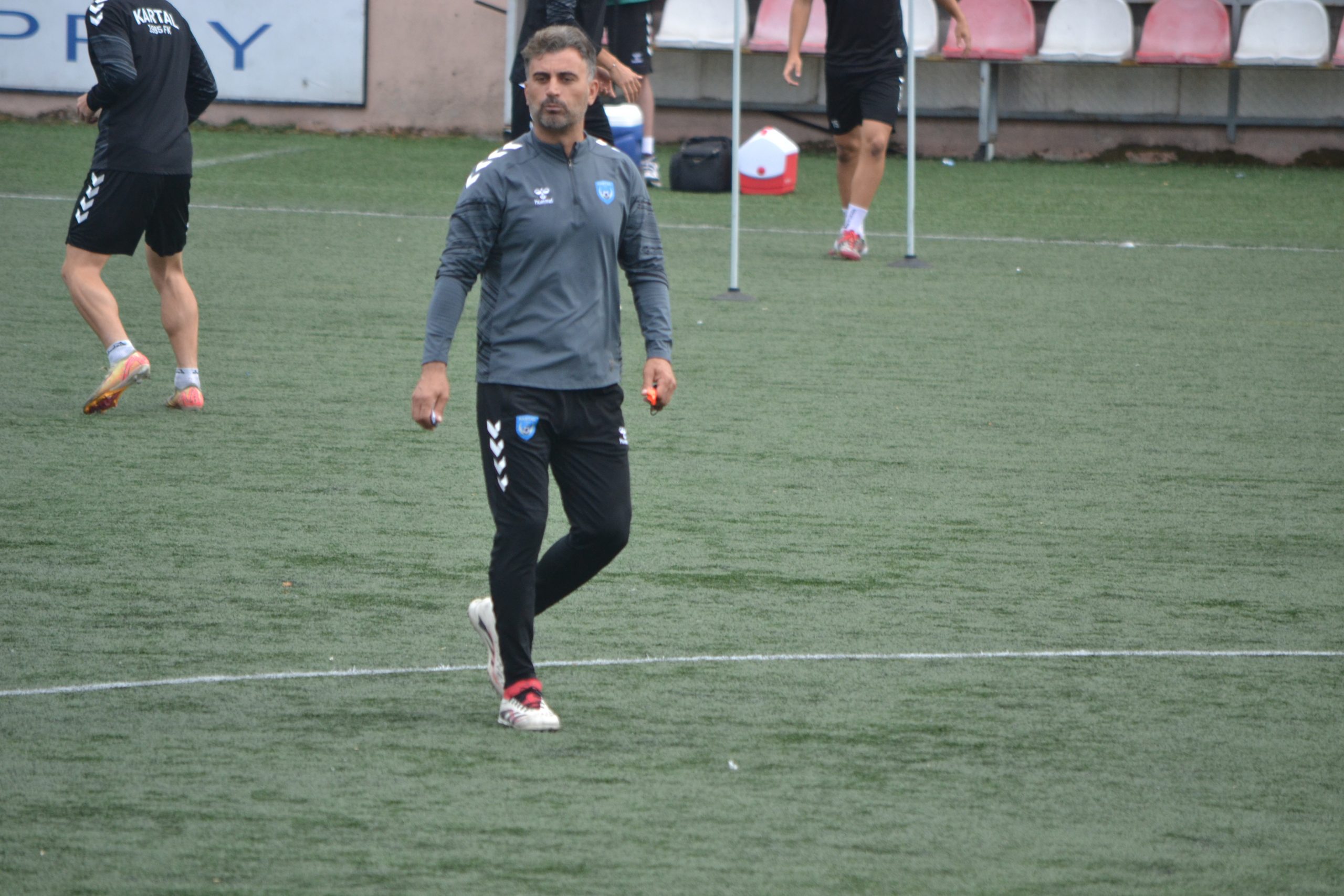 Teknik sorumlu İbrahim Cezayir idman öncesi futbolcularıyla saha içince kısa bir görüşme yaptı